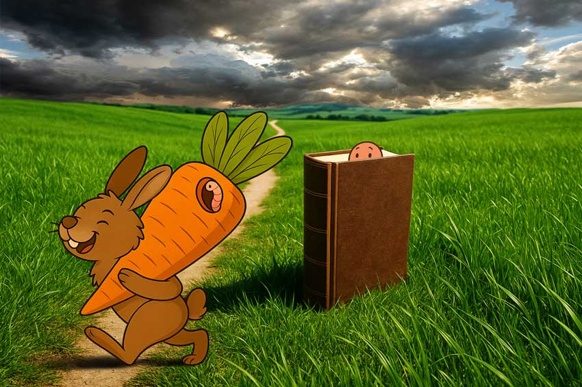 ספרים צבעוניים על דשא עם שורשים חשופים באדמה, ומעליהם שמיים עם עננים, מדגימים עריכת ספרים יסודית החודרת לשורשים.