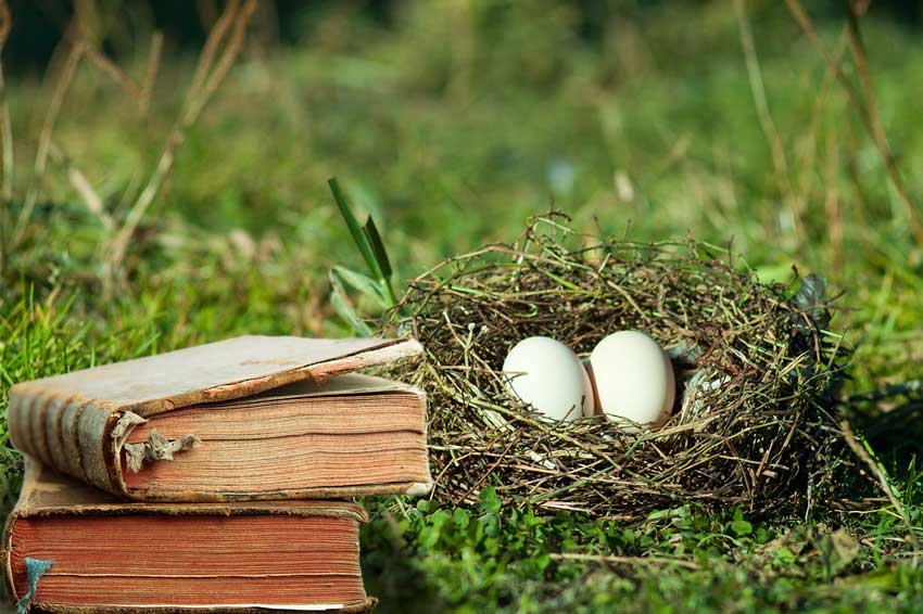 גדמי עצים בפארק המשמשים כספסלים ומעליהם אגרטלים ופרחים וביניהם ספרים, מדגימים מגוון שיקולים והכרעות בעריכה ספרותית ועריכה לשונית.